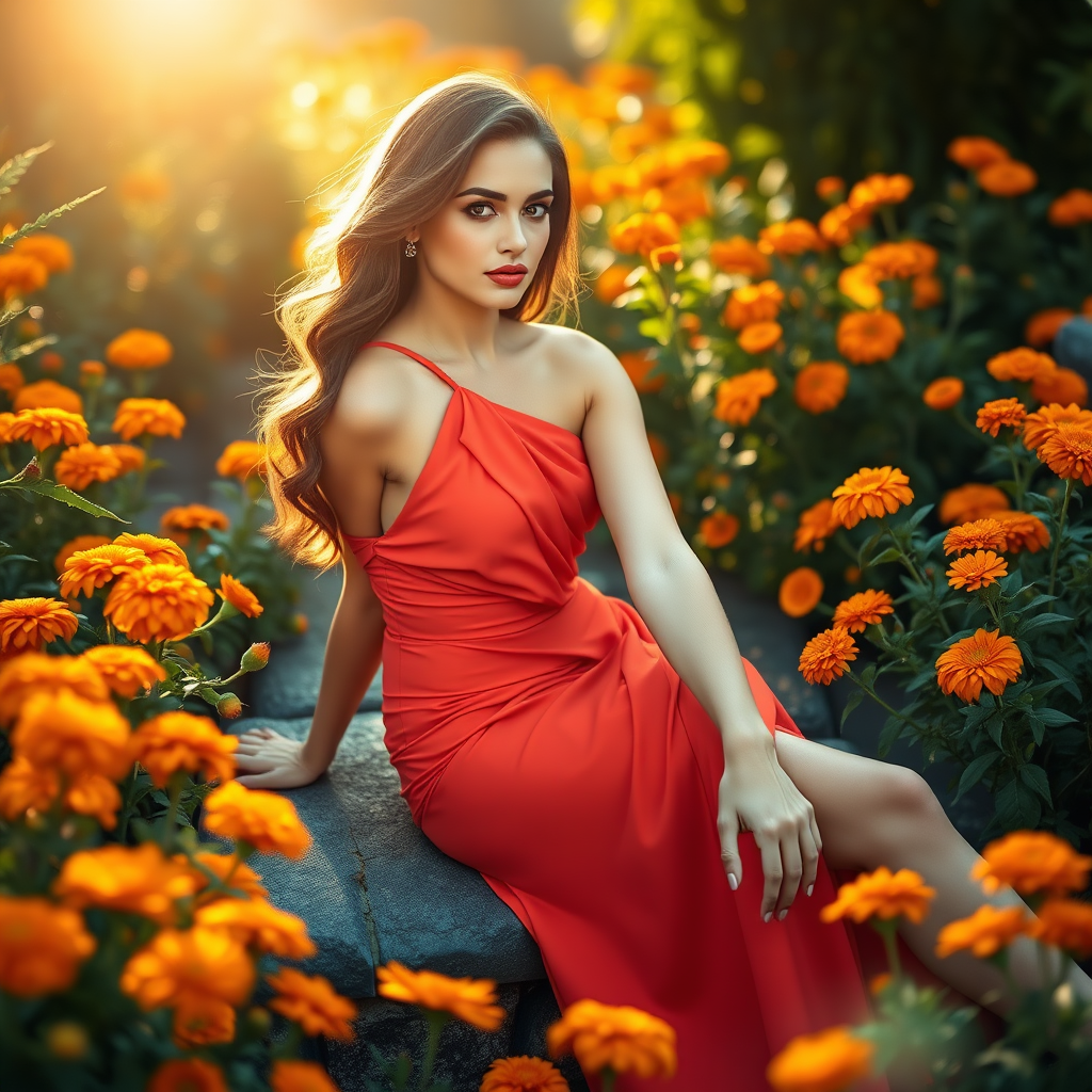 A stunning fashion model elegantly poses in a vibrant coral dress, gracefully sitting amidst a lush garden of marigold blooms, bathed in warm, golden sunlight.