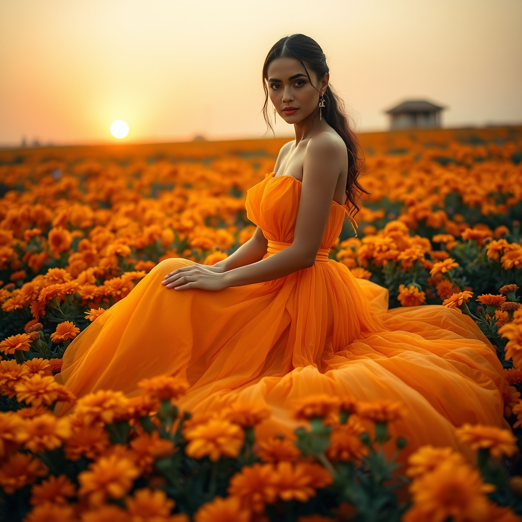 A stunning fashion model in a radiant tangerine gown gracefully seated amidst a lush carpet of blooming marigolds, capturing the harmonious dance of vibrant colors under the gentle glow of a setting sun.
