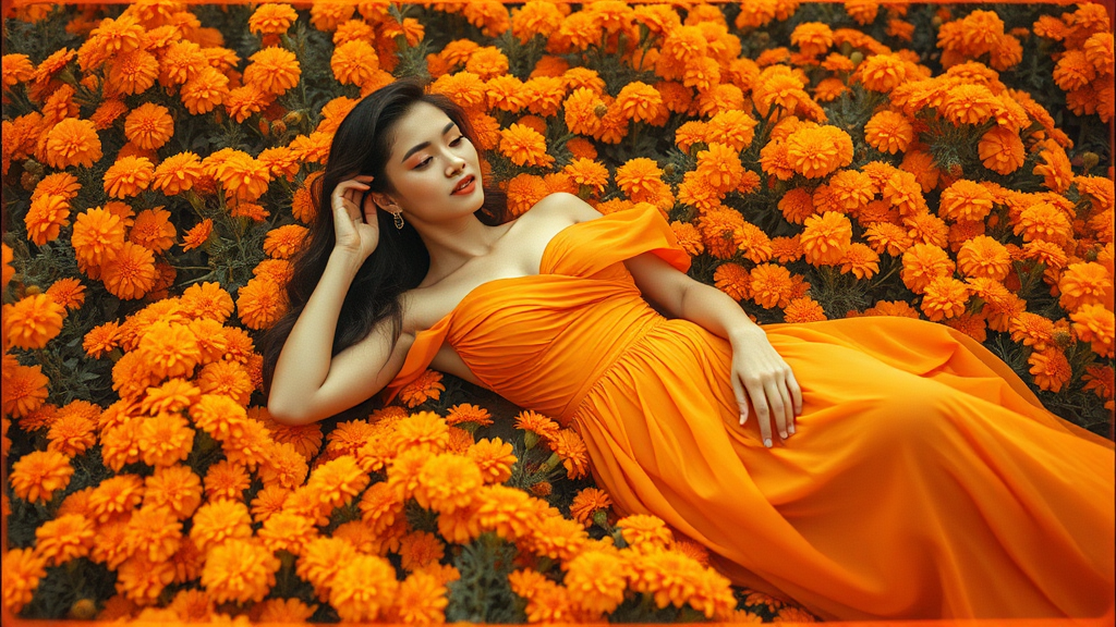A stunning fashion model in a vibrant orange dress is elegantly reclining amidst a lush sea of marigold blossoms, captured in the nostalgic style of Kodak disposable photography, evoking a warm and dreamy atmosphere with a 3:4 aspect ratio, subtly highlighting the harmony between her attire and the vivid floral backdrop.