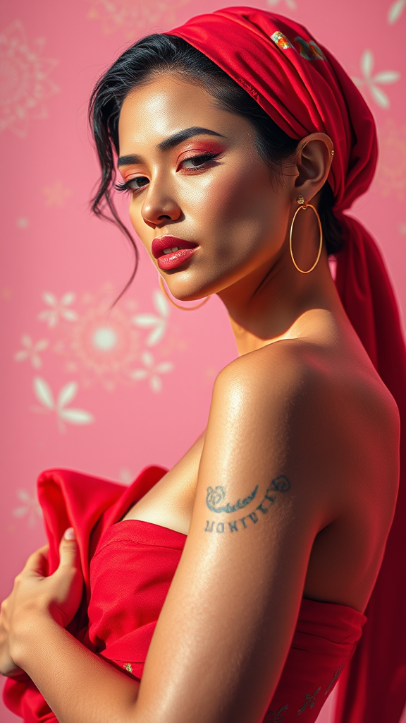 A stunning fashion model in a vibrant red wrap elegantly poses, exuding a sense of style characterized by colorful geometrical patterns. The scene is reminiscent of the vibrant visuals of Guy Aroch and the dreamlike essence of Unreal Engine 5, with a touch of Helene Knoop's artistry. The image is bathed in glowing pastel hues and defined by bold lines and bright, sun-soaked colors. Captured with the richness of a Fujifilm X-T4 and the sharpness of a Sony FE 85mm lens, the photograph reflects a raw, dynamic energy in an aspect ratio of 900:1600, emanating an enchanting fusion of aesthetics.