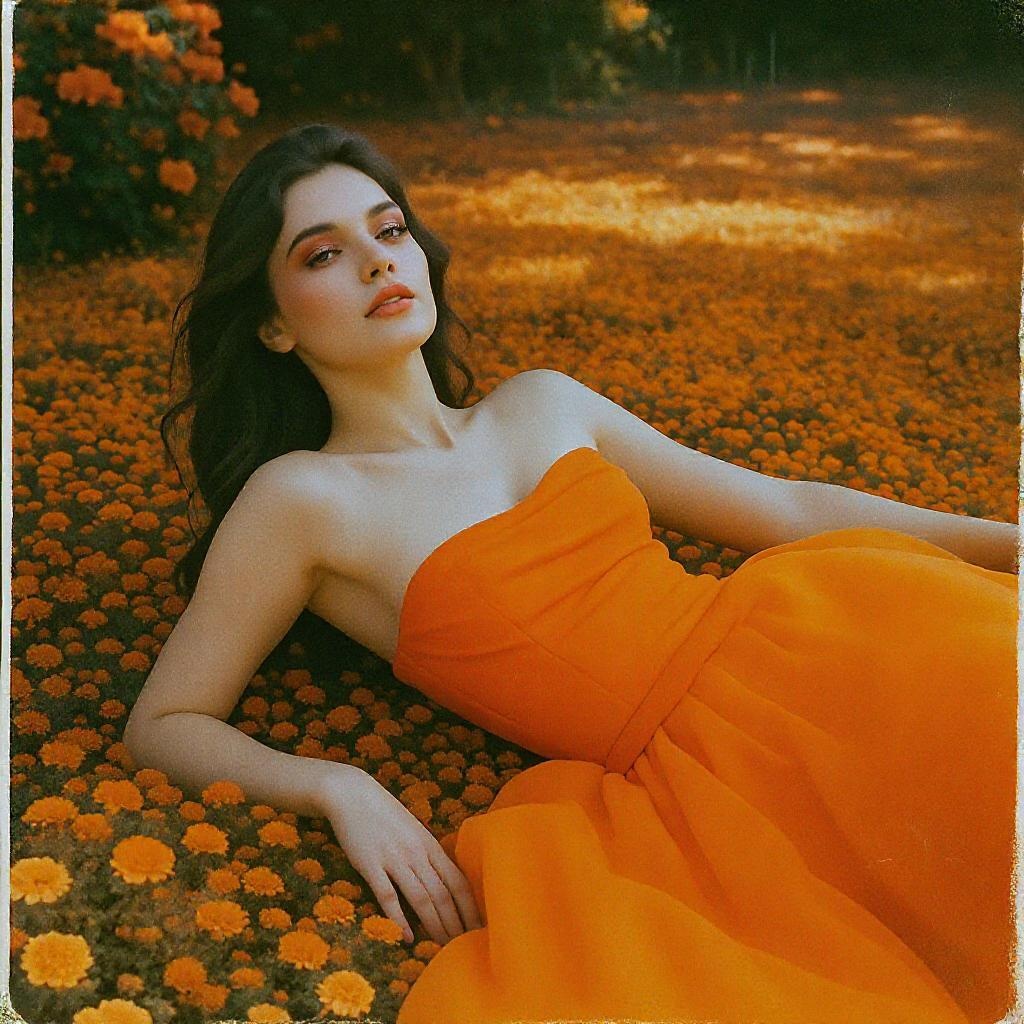 A stunning fashion model in an elegant orange gown, gracefully reclining on a vibrant bed of orange blooms, captured with the nostalgic charm of a Kodak disposable camera, creating an aura of vintage allure and ethereal beauty, with a 3:4 aspect ratio.