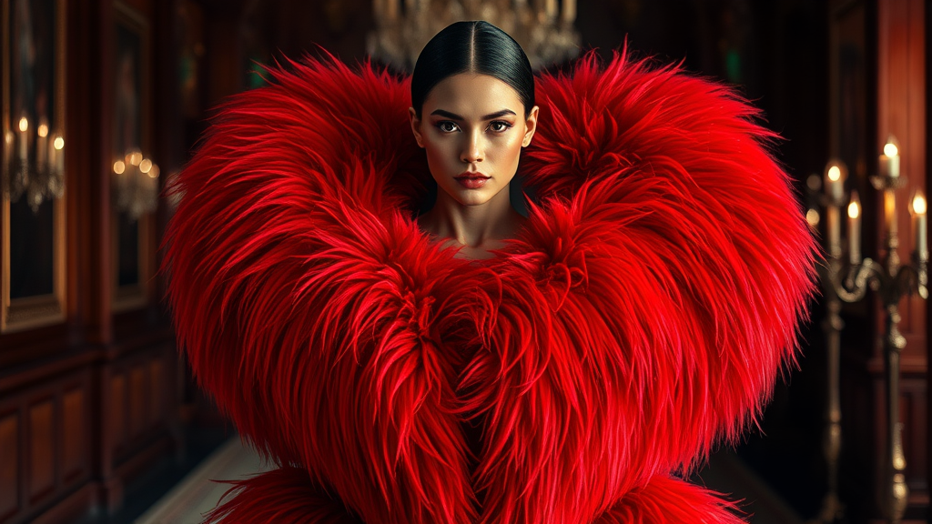 A stunning fashion shoot featuring an exquisite female model dressed in a luxurious oversized furry dress shaped like a red heart. The image is in sharp focus, capturing every intricate detail with cinematic clarity. The glamorous setting exudes an air of elegance and sophistication, with symmetrical composition that enhances the visual balance. The scene is impeccably lit, bringing out the vivid colors and textures of the attire, ideal for a high-fashion magazine spread. The aura is a blend of Vogue editorial chic and contemporary allure, inviting admiration and attention.