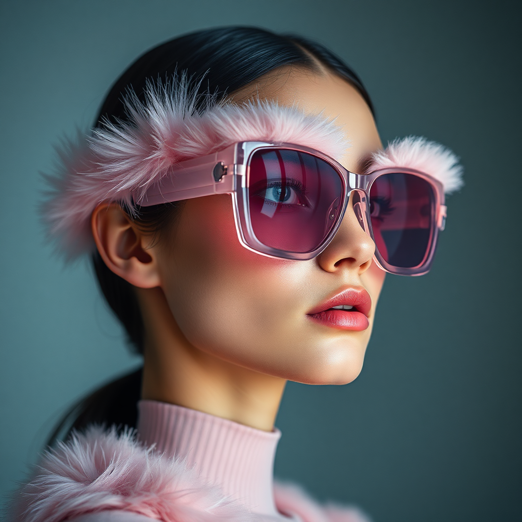 A stunning fashion shoot showcasing a collaboration between Jacquemus and Moncler, featuring an ultra-modern, light pink translucent fur trim on oversized sunglasses. The scene captures hyper-realistic detailing with an 8k resolution, emphasizing the exquisite textures of the fur and sleekness of the eyewear. The ambiance carries a soft, dreamy feel, enhanced by soft, diffused lighting that highlights the delicate hues of pink. The model, poised with a serene yet confident expression, exudes elegance and sophistication, seamlessly blending luxury with avant-garde style. Subtle creative elements introduce a play of shadows and reflections, adding depth and dynamism to the portrait. The overall effect is a mesmerizing fusion of fashion innovation and artistic photography, engaging viewers in a visual narrative that celebrates the allure of high fashion.