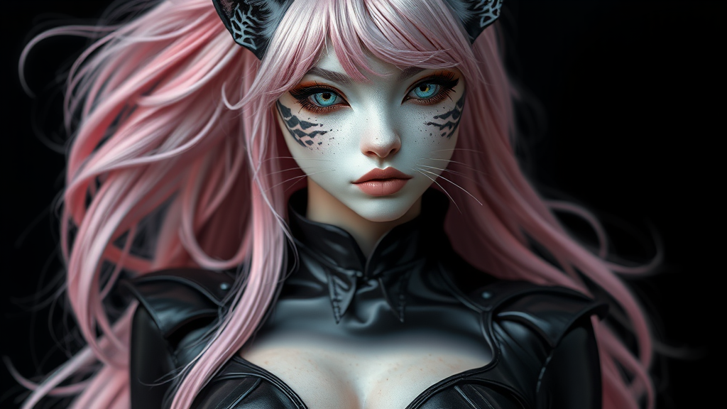 A stunning feline-inspired humanoid figure, adorned in a sleek black leather-like ensemble, with a cascade of pastel pink locks framing her ethereal features.