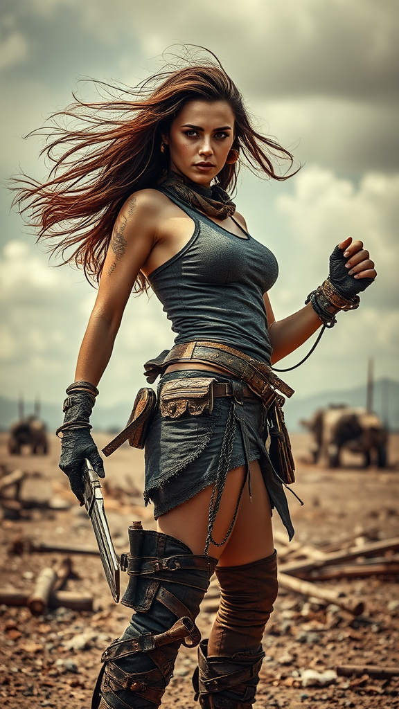 A stunning female bandit stands confidently in a post-apocalyptic wasteland, her captivating beauty contrasting with the desolate surroundings. She strikes a dynamic pose, exuding strength and grace, as the wind tousles her hair. Her detailed attire is a blend of rugged practicality and stylish flair, showcasing her adaptability in a harsh environment. In her hand, she wields a weapon with expert ease, embodying the spirit of survival. The cinematic quality of the scene is enhanced by ultra-sharp focus, capturing every intricate detail with breathtaking clarity. Despite the chaos around her, she remains a figure of resilience and allure, drawing the viewer into her world with intense visual storytelling. The setting reflects signs of decay, with remnants of a lost civilization scattered around, creating a powerful juxtaposition between beauty and destruction.