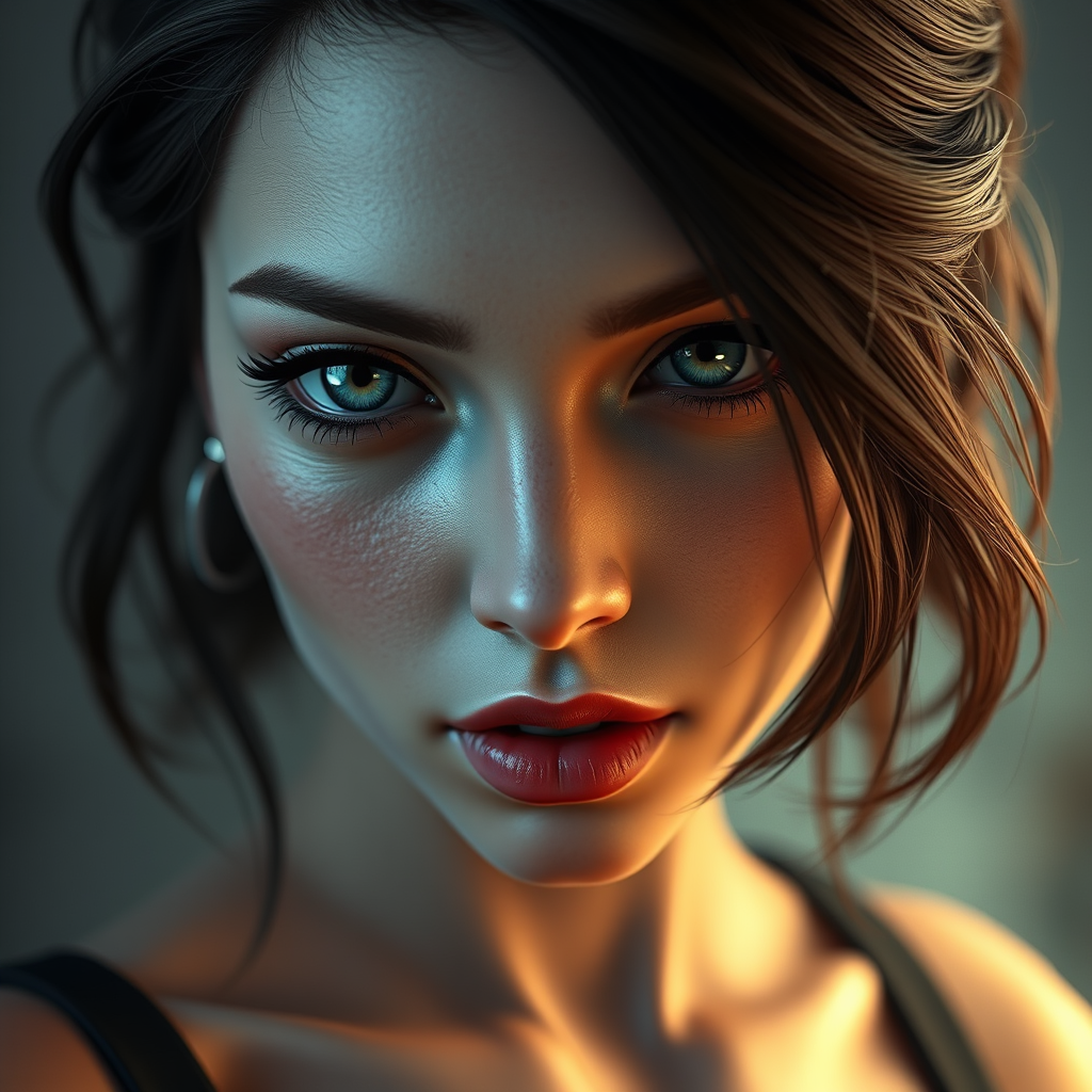 A stunning female character reminiscent of Jill Valentine from Resident Evil 3 remake, depicted in a redshift style with a flawless, intricate, and elegant face featuring high levels of detail. Captured in a 150mm portrait photograph using a Hasselblad H3DII for an epic cinematic effect with octane render and denoise. Inspired by the artistic styles of Tom Bagshaw and Seb McKinnon, trending on ArtStation. The image presents an extremely detailed CGI with intentional imperfections such as a slightly flawed face and eye, giving a unique deformed yet charming cartoon style twist.