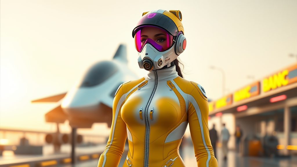 A stunning female character stands confidently in a sleek, form-fitting white and yellow jumpsuit at a bustling spaceport. Behind her, a futuristic spaceship takes off, its engines roaring into the vastness of space. She wears a mask adorned with a vibrant purple sci-fi visor and an advanced sci-fi respirator. The scene, trending on ArtStation, showcases extreme detail and cinematic brilliance. The environment is breathtaking, with shiny surfaces and a smooth, surreal quality that feels almost divine and celestial. Influenced by manga and anime, the atmosphere bursts with color under cinematic lighting. The hyperrealistic focus reveals intricate details, enhanced by the unreal engine 5's lumen reflections CGI, giving the composition a captivating 3D render quality. The character's form, reminiscent of a doll, is elegantly rendered using octane for a polished, artistic masterpiece.