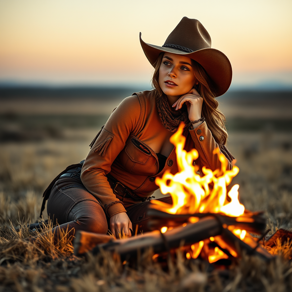 A stunning female cowboy rests by a crackling campfire on the expansive prairie, exuding western charm and breathtaking beauty. The scene captures a comprehensive cinematic quality, with highly detailed and best-quality visuals in ultra-sharp focus. The borderlands setting adds an enchanting backdrop, with a clear, open sky and endless horizon. Her rugged attire and graceful posture perfectly blend, illustrating strength and elegance in harmony with nature. The campfire casts warm, flickering light, highlighting her features with a soft glow, and creating a tranquil, captivating atmosphere that resonates with the timeless spirit of the Old West.