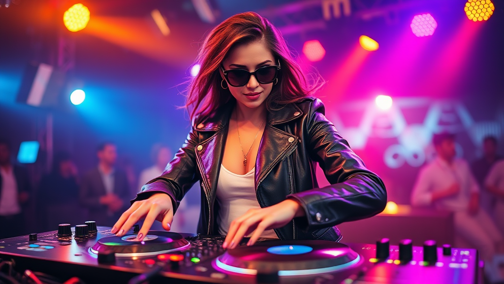 A stunning female DJ in stylish sunglasses and a sleek leather jacket mixes tracks on turntables, immersed in the rhythm while dancing energetically. Vibrant disco lights create a dynamic atmosphere, highlighting her commanding presence. Composed with a cinematic approach, capturing her at a golden ratio position, the scene is alive with creativity. Despite the vibrant energy, the visual maintains elegance and focus, avoiding any unnecessary or distracting elements. The DJ's hands move with precision, emphasizing her skill and passion for music. Her confident demeanor and the lively setting inspire and captivate.