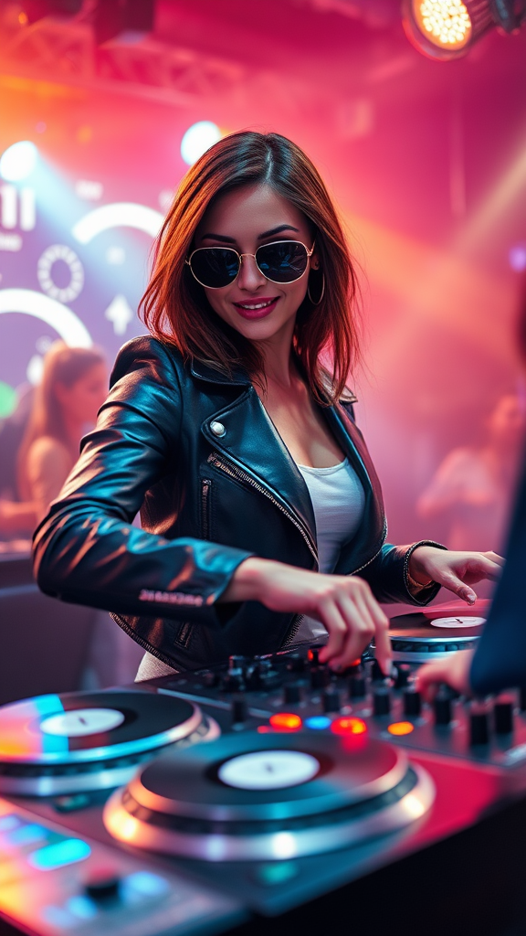 A stunning female DJ wearing stylish sunglasses and a sleek leather jacket, skillfully spinning turntables while grooving to the beat. Surrounded by vibrant, colorful disco lights, the scene captures a sense of energy and rhythm. Composed with attention to the rule of thirds and the golden ratio, the image showcases a cinematic quality and high resolution. The DJ's confident presence and dynamic movements create an engaging and lively atmosphere.