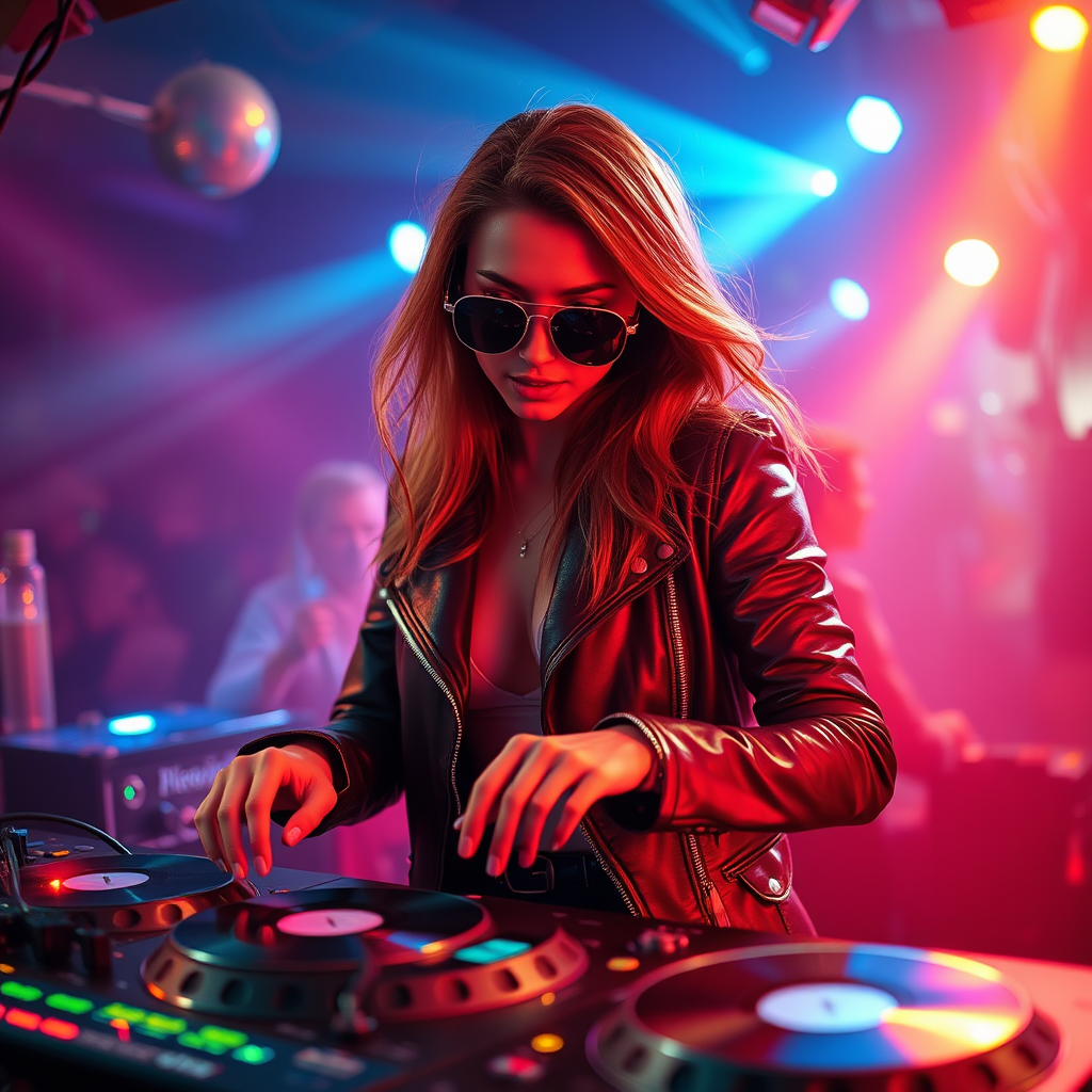 A stunning female DJ with sunglasses and a leather jacket, energetically spinning turntables and dancing amidst vibrant disco lights. The composition follows the rule of thirds and the golden ratio, creating a cinematic feel. She is portrayed with style and confidence, exuding a lively atmosphere without any focus on imperfections. The scene captures the dynamic essence of a nightclub, with the DJ as the charismatic centerpiece.