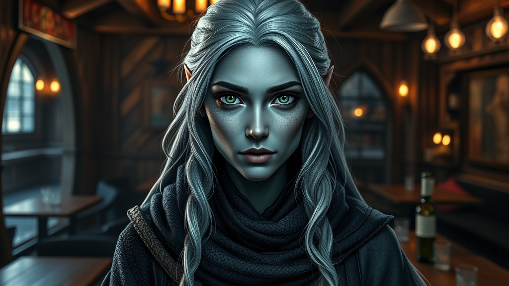 A stunning female Drow thief from the D&D Circle of Stars with perfect eyes, captured in a full-body digital portrait. Featuring a realistic and detailed face, she has gray skin and is adorned in attire suitable for a beautiful, dark fantasy character. The scene is set in a medieval tavern, with moody and dramatic lighting that enhances the atmospheric ambiance. The image is rendered in 8k UHD HDR, highlighting the character's features with exquisite detail. She stands confidently, her expression enigmatic, reflecting her mysterious and alluring nature.