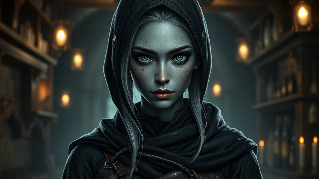 A stunning female drow thief from the D&D Circle of Stars, featuring perfect eyes and a detailed realistic face. Her gray skin captures the essence of dark fantasy. She stands in a medieval tavern with moody lighting, creating a dramatic and atmospheric scene. Her attire is reflective of her rogue lifestyle, with hints of starlight woven into her garments. The digital portrait is rendered in 8k UHD and HDR for striking clarity. The setting enhances her allure, casting mysterious shadows around her. Avoiding distractions like watermarks or logos, the image maintains focus on her captivating presence without any technical imperfections.