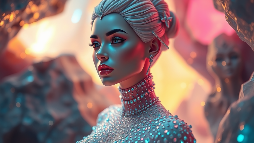 A stunning female figure emerges, crafted from shimmering diamonds, luxurious silk, and radiant gemstones, her surface adorned with sparkling dots. She stands in a mystical crystal cave, where Darek Zabrocki's style of magic realism flourishes in vibrant gradient colors. The scene is bathed in cinematic lighting with a bokeh effect, captured in ultra-detailed 3D quality using Octane Render and Unreal Engine. Visual effects enhance the isometric perspective, the entire scene meticulously designed in Blender, resulting in an 8K ultrahd cinematic wallpaper. The focus is on the enchanting atmosphere and intricate details rather than a closeup portrait, maintaining an aspect ratio of 1:2.