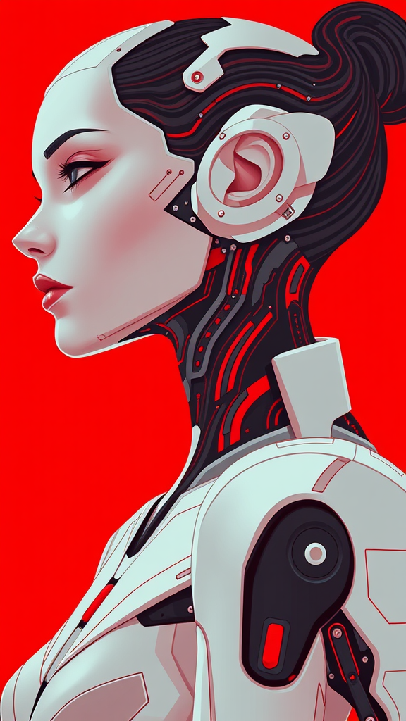 A stunning female figure featuring robotic elements, with visible circuitry integrated into her skin, showcased in a close-up profile view of her face and neck. The design embodies sleek, clean lines with minimalistic details and a cyberpunk aesthetic, set against a vibrant red backdrop. The composition is futuristic and portrayed in a 2D flat style, utilizing rich red tones and digital artistry reminiscent of Studio Ghibli, emphasizing elegance and tech-inspired beauty.