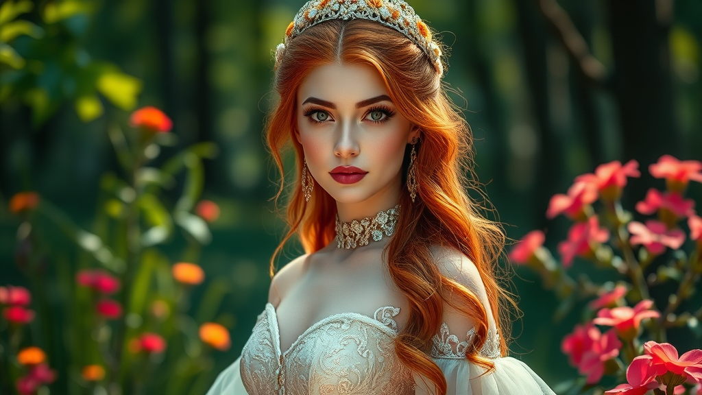 A stunning female figure with perfect ginger features, adorned in an elaborately designed wedding dress that befits an empress or queen. Her attire is complemented by elegant jewelry, including earrings and a tiara, giving her a regal appearance. She stands in a serene natural setting, surrounded by a lush forest and vibrant flowers, showcasing her captivating and expressive eyes. With her long, flowing red hair cascading down her shoulders, she poses amidst volumetric lighting that highlights the cinematic and epic nature of the scene. The composition features high detail, with emphasis on the hyper-realistic elements and post-processing techniques akin to the redshift style. The image invokes the feel of an illustration or oil painting, incorporating film grain to enhance its artistic depth. The overall atmosphere is one of breathtaking beauty and majesty, capturing the essence of a timeless and enchanting portrait.