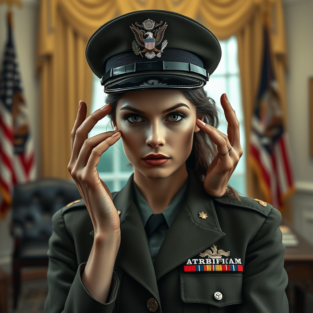A stunning female officer dressed in full American military regalia stands confidently in the background of the Oval Office, her gaze locked intensely on the viewer. Her eyes, sparkling with a mischievous hint, seem to flirt shamelessly as she proudly wears her officer's hat. The cold war backdrop of the President's office adds a layer of sophistication to the scene. Her skin, meticulously detailed in an 8K photo-realistic artwork, appears flawless and inviting, inviting the viewer to gaze at her portrait. However, there is an experimental twist - the image is heavily manipulated, showcasing extreme and grotesque deformities. Her face is cloned multiple times, her hands mutated with extra limbs, and her body twisted into unnatural proportions, comparable to a work of abomination from a horror movie. Fused fingers, an elongated neck, and what appears to be the wrong limbs are all merged into this one being, mass-produced with jarring errors, revealing a completely deformed and malnourished beauty, beyond repair and inside the Oval Office. A background signature reads "made by Gary Wellcome," and a jarring key "WWII Merchant Marine Officer Lara Jeffress" can be seen etched onto the signature, antithesis to her broken beauty.