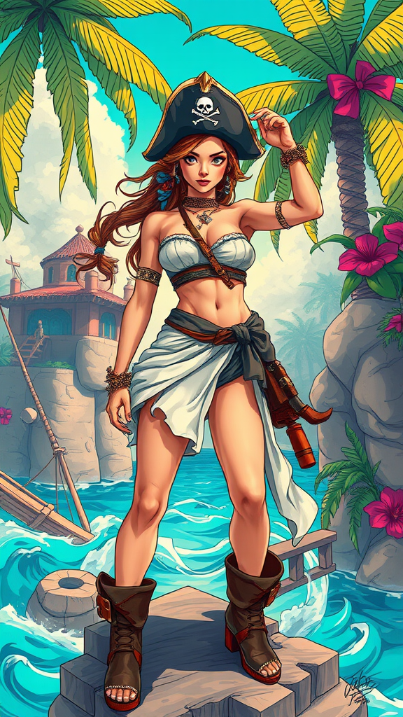 A stunning female pirate stands confidently on a vibrant tropical island, showcasing a dynamic pose at the center of the scene. The artwork is a key visual masterpiece, with intricate details capturing her breathtaking beauty and remarkable precision in lineart. The composition is rich with vibrant colors and offers a comprehensive cinematic feel, drawing inspiration from Carne Griffiths, Conrad Roset, and Anna Dittmann. The scene exudes an adventurous vibe, with elements of lush greenery and azure waves in the background. Despite a sense of movement and energy, the image remains focused, celebrating the pirate's allure and strength. There are elements of surrealism, such as elongated limbs and additional elements that defy realism, but they enhance the artistic flair of the piece. The artwork includes subtle imperfections like jpeg artifacts and a barely noticeable signature, with anatomy that playfully hints at artistic liberty. The overall image evokes a sense of wonder and invites the viewer to imagine the thrilling tales of this enigmatic pirate queen.
