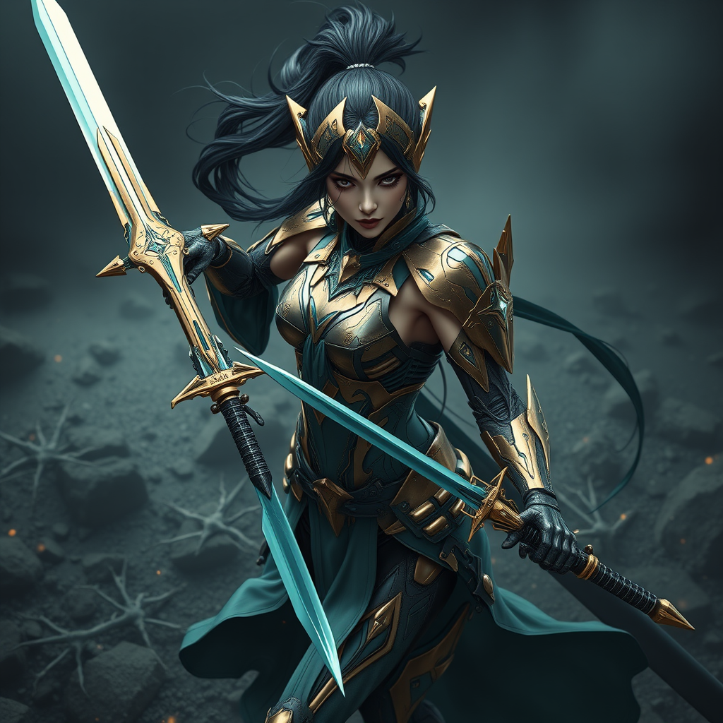 A stunning female warrior, embodying the essence of damage and agility, wields two elegantly crafted swords with an air of fierce determination. Her design reflects the principles of robotic expressionism, featuring an intricate blend of dark gold and dark cyan hues that shimmer with a futuristic edge. She is adorned with advanced technological contraptions that enhance her form, evoking the artistic legacy of Alois Arnegger and the dynamic gracefulness characteristic of Xu Beihong. Captured from a high-angle perspective, her pose is one of fluid precision and strength, reminiscent of the serene yet powerful presence of Nusch Éluard. The scene unfolds in a mysterious, otherworldly setting, where her every movement speaks of an unknown future.