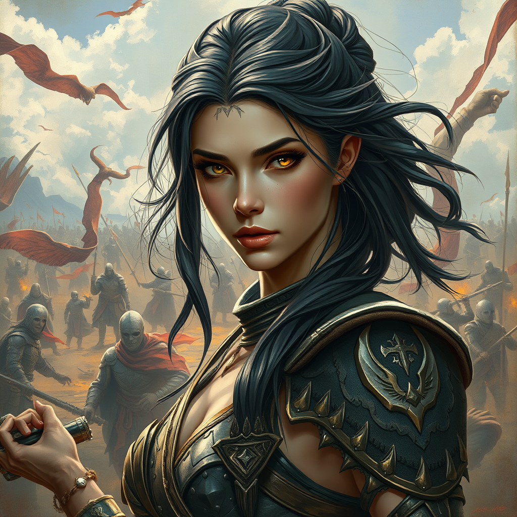 A stunning female warrior standing amidst a battlefield, with a captivating and highly detailed face. She embodies fantasy woman allure in an epic fantasy art illustration. The scene is intricate with hyper-detailed concept art, capturing the essence of fantasy with smooth lines and sharp focus. The composition maintains harmony despite hints of distortion, such as missing fingers, extra digits, or cropped elements, adding an enigmatic touch. The visual may include jpeg artifacts and accidental signatures, with a touch of surreal elements like misplaced limbs or unusual anatomy. The artwork is slightly out of frame, suggesting a mysterious narrative, while avoiding grotesque or overly disfigured aspects, ensuring the piece remains intriguingly sublime despite hints of chaos.