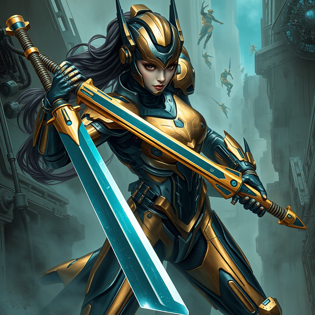 A stunning female warrior wielding dual swords, depicted in the style of robotic expressionism. Her metallic armor and features shine in dark gold and deep cyan hues, enhanced with futuristic contraptions. Drawing inspiration from Alois Arnegger's dramatic perspectives and Xu Beihong's graceful forms, she strikes a poised and fluid stance, reminiscent of the elegance of Nusch Éluard. The scene is captured from a high-angle view, emphasizing her power and grace amidst a backdrop of advanced technology and abstract environments, blending art and science seamlessly in a vertical composition.