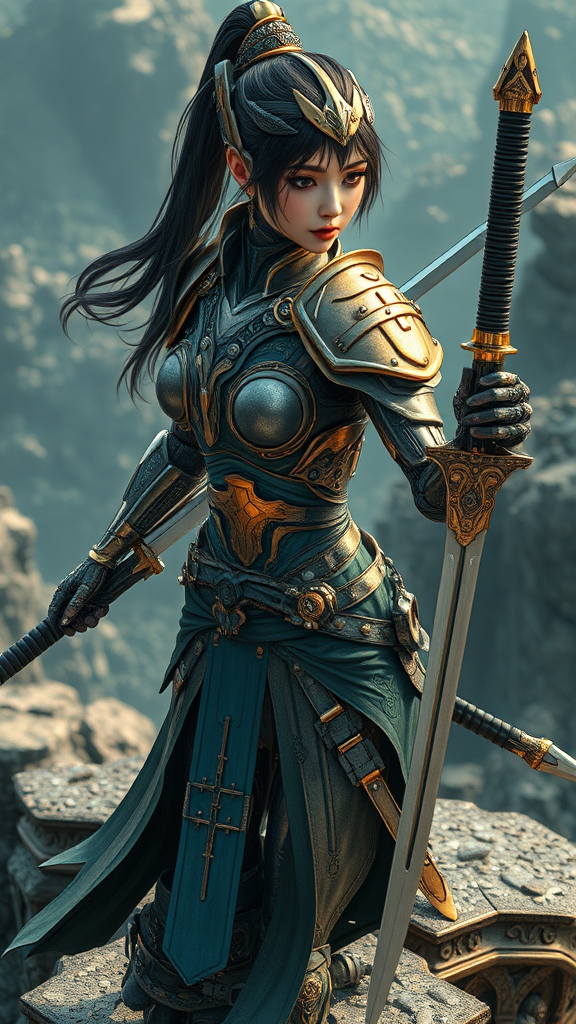 A stunning female warrior with two elegantly designed swords, embodying the essence of robotic expressionism. Her attire and armor glisten with hues of dark gold and dark cyan, intricately detailed with futuristic contraptions that display advanced technology. Her form is captured in a high-angle view, reminiscent of the grand landscapes of Alois Arnegger, yet infused with the grace and fluidity of Xu Beihong's style. Her poses exude a serene yet powerful presence, akin to the ethereal quality of Nusch Éluard. The scene is a harmonious blend of mechanical intricacies and artistic elegance, creating a visually striking tableau.