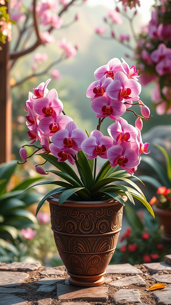 A stunning flower pot brimming with vibrant orchids stands gracefully in an enchanting outdoor scene, capturing the eye with its breathtaking detail. The composition follows the rule of thirds, creating a cinematic and harmonious balance that draws viewers into its serene beauty. Rendered in absurdly high resolution, the artwork is a masterpiece, reminiscent of a whimsical Studio Ghibli painting. The lush environment surrounding the orchids is brought to life with a touch of magical realism, where every petal and leaf is meticulously crafted. Despite an element of unpredictability, the scene exudes a dreamlike quality, marrying nature’s charm with an artist’s imaginative flair.