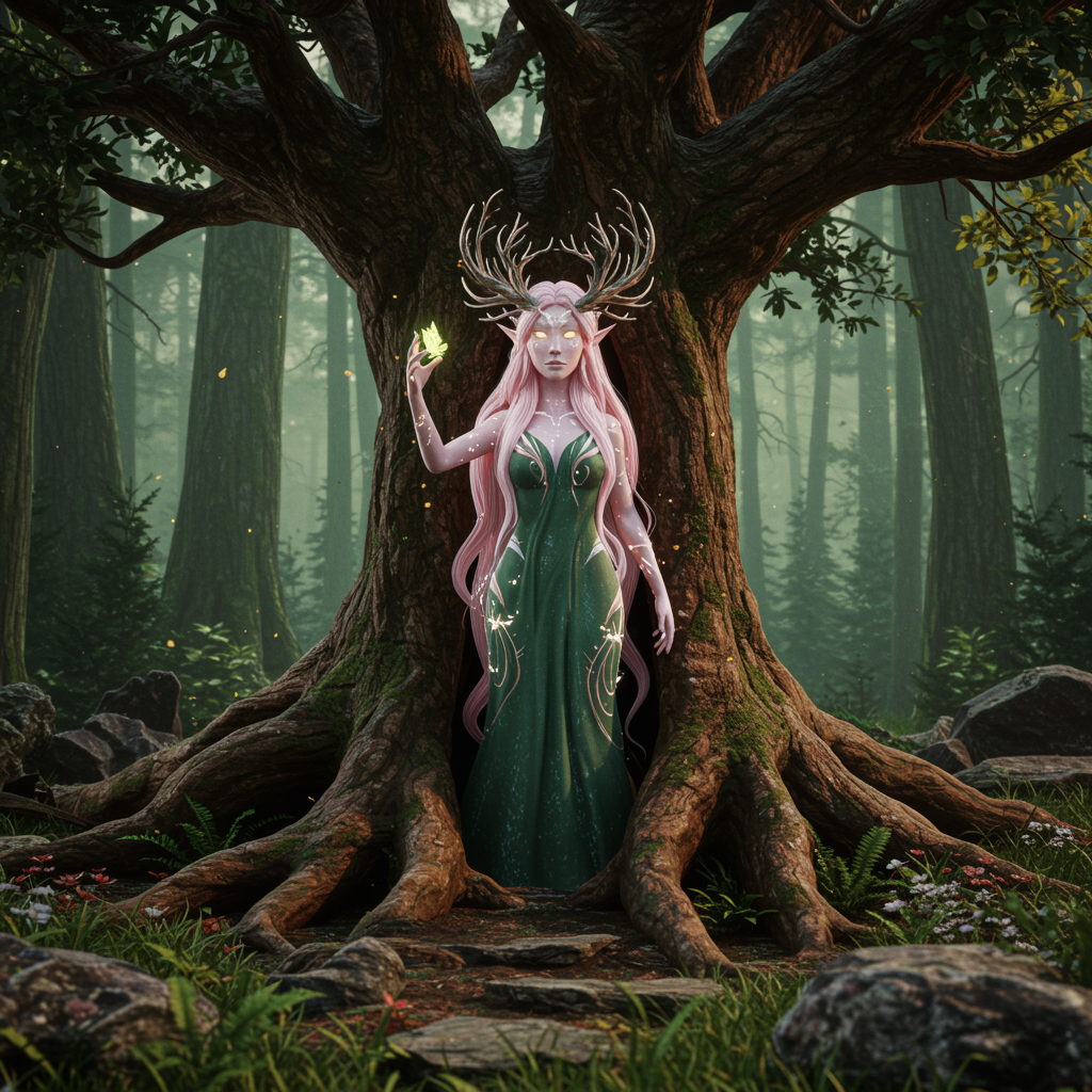 A stunning forest deity woman with cascading long hair and pale, luminescent skin stands gracefully within the heart of a colossal ancient tree, her presence encapsulating a mystical aura. Crafted in the visionary style of MountainDog Studios, she embodies a fusion of detailed face design and character illustration. The scene comes to life in clip art style combined with an immersive 3D render, powered by Unreal Engine, enhanced with dynamic VFX and cinematic lighting. Presented in an isometric view with a low-poly aesthetic, the creation is meticulously made in Blender, achieving an ultra-realistic, 8k, photorealistic quality with a cinematic feel. The harmonious blend of nature and artistry unfolds amidst an ethereal forest ambiance, maintaining a 2:3 aspect ratio, soaked in intricate details and vibrant chaos, with a rendering quality set to 2.