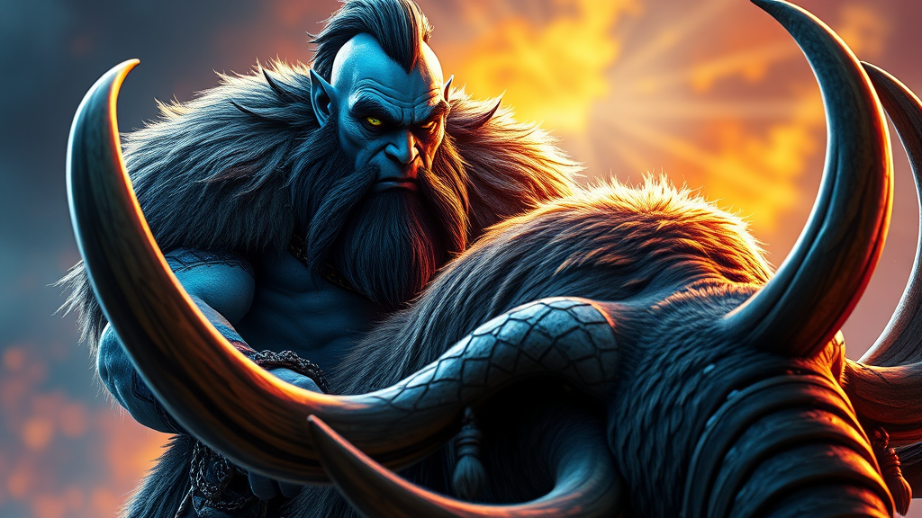 A stunning full-body depiction of a blue-skinned orc warrior with a commanding presence, astride a majestic mammoth with sharp tusks. The orc's noble features are highlighted in vivid colors and dramatic lighting, showcasing intricate details in a hyper-realistic style. The digital art concept is rendered in 8K resolution using Unreal Engine 5, ensuring sharp focus and a high-definition finish that captures the essence of an epic masterwork. The orc's eyes are intensely detailed, with vibrant depth that draws the viewer in. The side-lighting enhances the orc's form, set against a colorful, dynamic background, making the composition suitable for trending splash art on platforms like Artstation. The scene is balanced and realistic, emphasizing correct anatomy with exceptional clarity and well-executed elements in a mid-angled shot, ensuring an immersive and captivating visual experience without distortions or unrealistic features.
