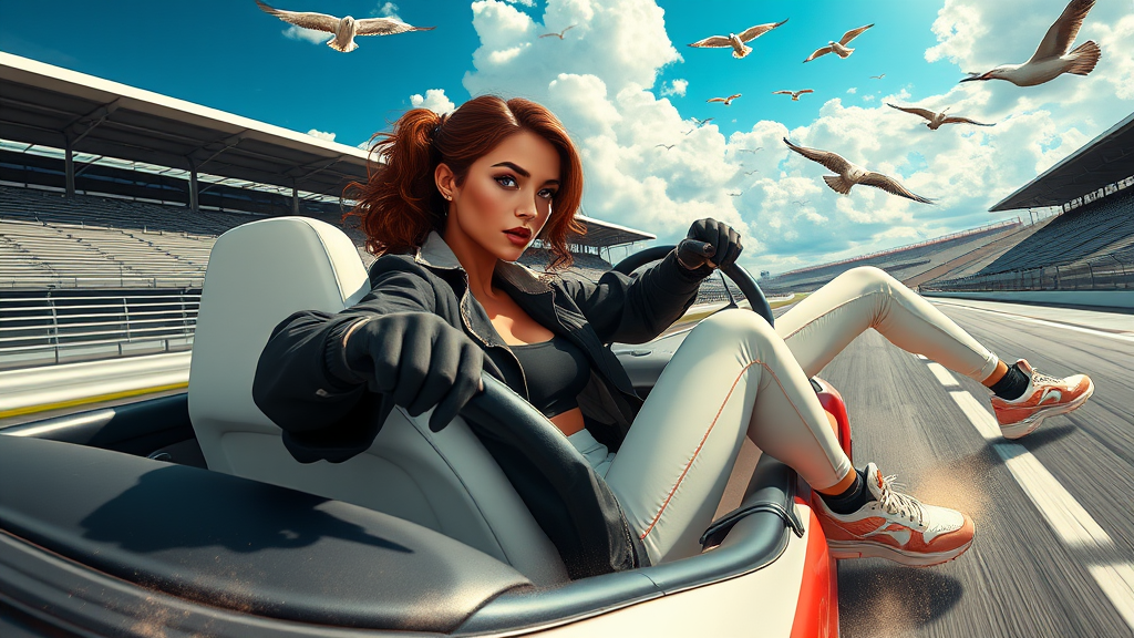 A stunning full-body depiction of an elegant woman as a spirited racing enthusiast driving a convertible with white seats. She possesses tanned skin and prominent cheekbones, with an expression of fierce determination and slightly parted lips. Her reflective eyes, framed by dark eyebrows and subtle mascara, enhance her captivating visage. She wears racing gloves, with dust particles glistening in the detailed, rim and chiaroscuro lighting. Her attire consists of a stylish black crop top, an open jacket, and white yoga pants paired with large pink sneakers. She speeds along a race track surrounded by the road, bleachers, a vibrant blue sky, fluffy white clouds, and birds soaring above. The scene is a harmonious mix of artistic influences from John Constable, Ed Blinkey, Atey Ghailan, and is reminiscent of the animated essence of Studio Ghibli. The style embodies the rich drama of Jeremy Mann and Greg Manchess, with the vibrant storytelling of Antonio Moro. The image exudes intricacy and high detail, featuring elements of magical realism in a way reminiscent of Makoto Shinkai's Kyoto influences. Trending on platforms like ArtStation and CGSociety, this depiction is detailed and dramatic, with shades of whimsical unnatural hues harmonized by Iron Mouse-inspired blue hair and quirky headphones. A pink car adds a playful element, embracing a canvas frame and cartoonish 3D allure while maintaining clarity and artistic precision.