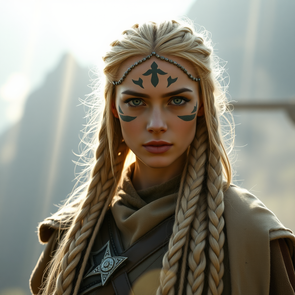 A stunning, full body image captures a 25-year-old war princess, exuding an aura of elegance and strength in an urban fantasy setting. Her long, braided blonde hair flows gracefully, adorned with intricate cultural face paint. She stands confidently in her cloth armor, set against a breathtaking, foggy mountain backdrop. Her bright grey eyes and captivating gaze are the focal points, revealing a sense of allure and mystery. The scene, reminiscent of a cinematic film still from an 80s movie, embodies the grainy texture of 35mm film shot with a vintage 1950s camera. The photograph, tinged with the vibrant tones of Kodak Portra 800, showcases ultra-realistic details, highlighting her perfectly symmetrical features and natural skin texture. Radiant light beams dance through the mist, creating an ethereal, magical atmosphere. Dust floats gently in the light, adding to the enchanting mood. The high-resolution image, resembling a work of art, captures every detail with sharp focus, revealing beautifully detailed facial features, intriguing expressions, and a harmonious symmetry in both the princess and the surrounding environment. The aesthetic embodies realism amplified with artistic exaggeration, blending features of analog style with modern digital painting techniques, resulting in an exceptional piece that seems almost otherworldly yet strikingly real.