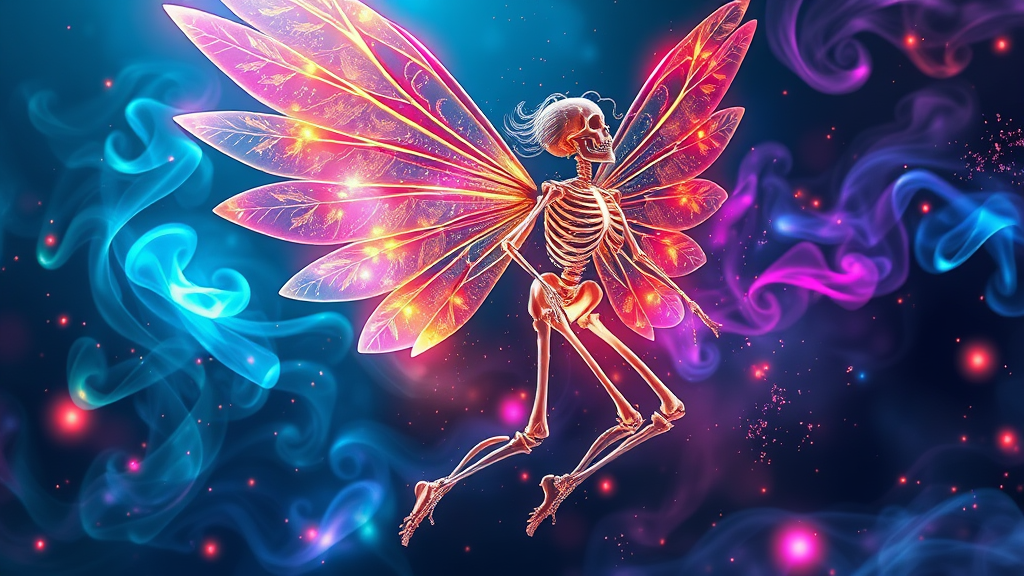 A stunning full body image of a fairy featuring a detailed fairy skeleton diagram with intricate wing skeleton and anatomical details, set in a captivating fairytale theme illustration. The scene is infused with magic, showcasing luminous multicolor swirling smoke and radiant glowing particles. The atmosphere is enriched with low neon effects, highlighting sharp focus and intricate details. This concept art resembles a contest-winning piece, reflecting professional quality, akin to works on ArtStation, Imgur, and Pinterest. Rendered in high definition, from HD to 8K, this creation exemplifies pro perspective work, reminiscent of a colorful oil on canvas painting.