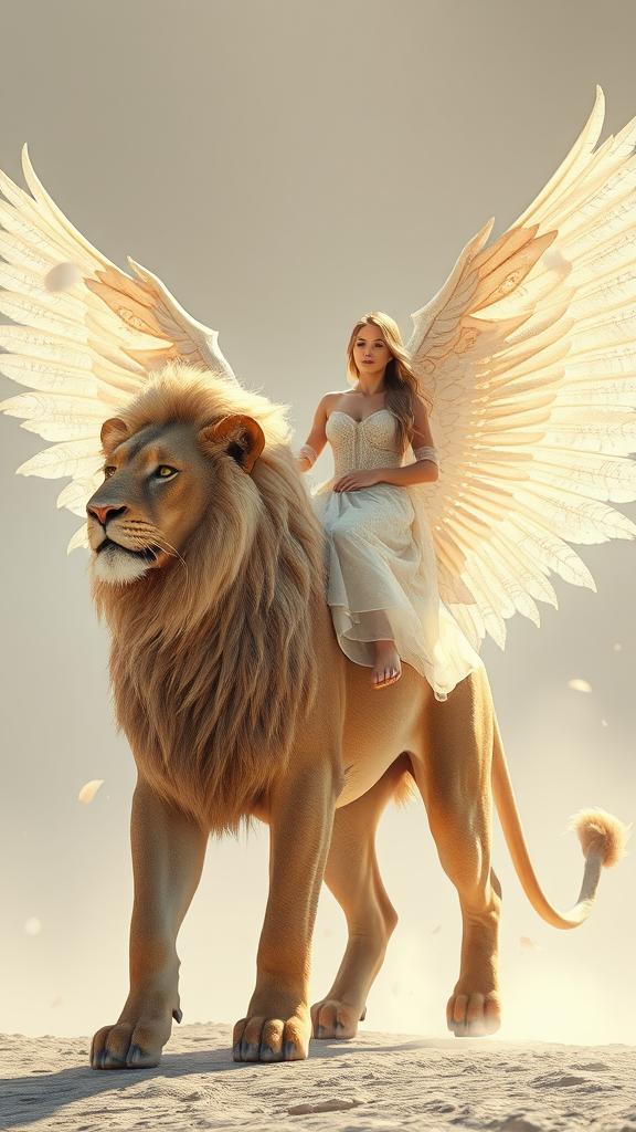 A stunning full body photograph captures a majestic mythical lion with ethereal, outstretched feathery wings. Its wings are glowing with intricate transparency, and a graceful woman rides confidently on its back. The scene showcases symmetrical, hyper-detailed textures with delicate pearl filigree. The composition is inspired by concept art from Alice X. Zhang and Andreas Lie, presenting a masterpiece of perfect lighting and focus. Captured with a high-resolution DSLR camera, this ethereal shot emphasizes natural lighting and a sharp 64-megapixel clarity, bringing a sense of professional, glittering photography to the image. The lion's powerful form blends seamlessly with the rider's elegance in a captivating, imaginative portrayal.