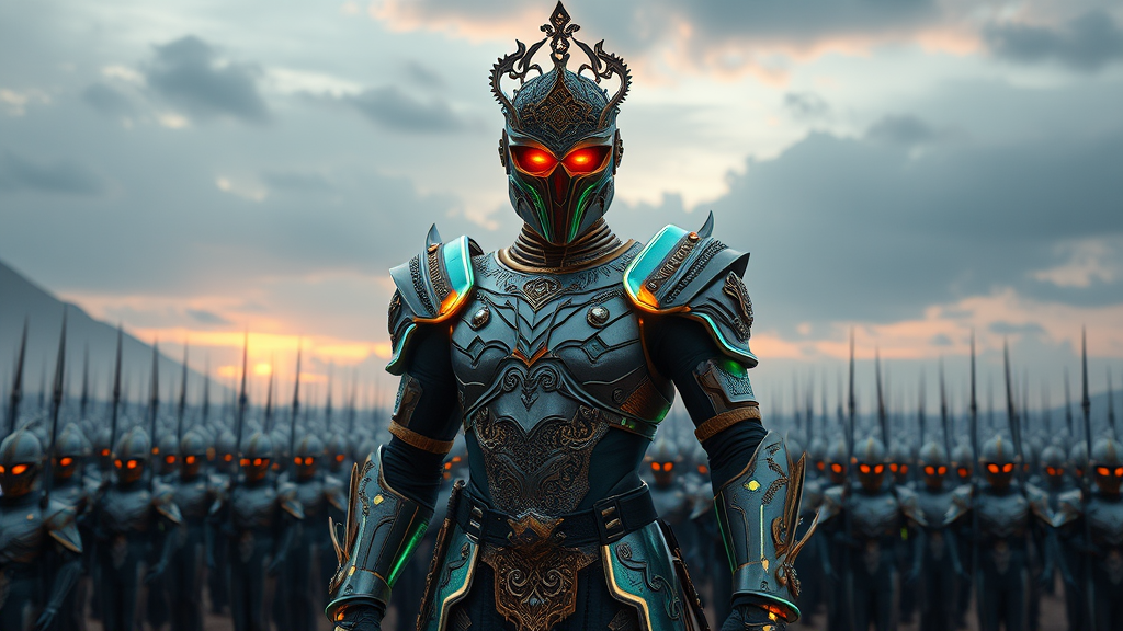 A stunning full-body photoshoot captures an awe-inspiring necromancer soldier of the future, clad in exquisite royal armor fusing intricate cyber technology with baroque elegance. Standing triumphantly at the forefront of the imperial army, the figure exudes a commanding presence in a victorious pose. The armor, a seamless blend of holographic elements and dieselpunk aesthetics, shimmers with ethereal hues and emits a soft glow of iridescent light. The soldier’s eyes, imbued with arcane energy, peer through a sleek helmet adorned with intricate metallic filigree. The scene, inspired by the visionary art of Adam Fisher, portrays a world where ancient mysticism and futuristic innovation unite in a harmonious dance of power and beauty. In the background, a vast army stands at attention, their cybernetic enhancements glinting under an otherworldly sky, ready to follow their enigmatic leader into destiny.