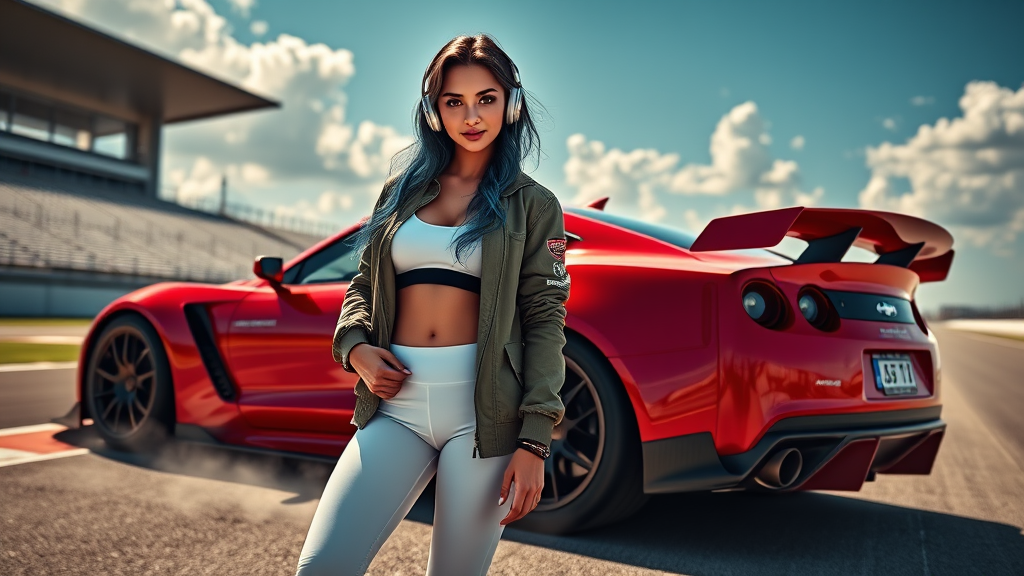 A stunning full body portrait of a beautiful racecar woman standing beside a sleek race car on a race track. She has tanned skin and long hair, with a detailed, symmetrical face and a captivating smile. Her eyes are reflective, complemented by dark eyebrows and expertly applied makeup. She wears an open jacket with white yoga pants while standing next to a red racecar with spoilers. The scene includes a dramatic lighting setup featuring dust particles, rim lighting, and chiaroscuro, with bleachers, a road, a blue sky, and white clouds in the background. The artwork boasts intricate and high detail, drawing inspiration from the styles of John Constable, Ed Blinkey, Atey Ghailan, Jeremy Mann, Greg Manchess, and Antonio Moro. It is trending on ArtStation and CGSociety, with a touch of Makoto Shinkai's Kyoto flair, depicting a blend of realism and artistic creativity. The woman's hair is uniquely blue, reminiscent of the Iron Mouse, and she wears headphones, adding an interesting twist to the composition. The piece maintains strong anatomy and high-quality rendering throughout.
