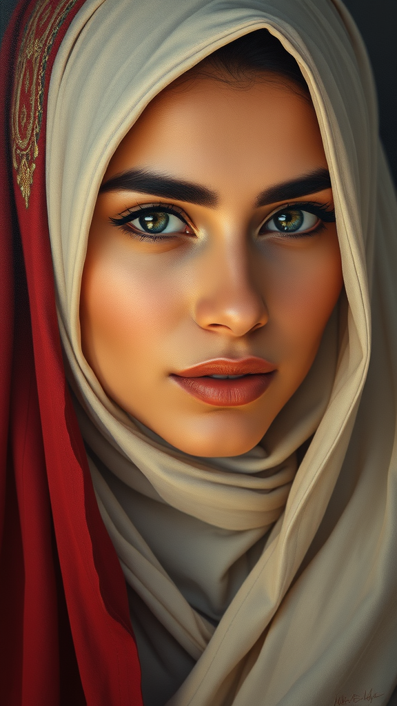 A stunning full-body portrait of a captivating Muslim Arab woman in a model shoot style, showcasing a majestic and professional oil painting inspired by the masters like Ed Blinkey, Atey Ghailan, Studio Ghibli, Jeremy Mann, Greg Manchess, and Antonio Moro. The artwork displays intricate detail, sharp focus, and dramatic elements, reflecting a photorealistic style. The composition avoids odd colors and maintains clarity with well-proportioned anatomy and features, celebrating beauty and grace. Emphasize high craftsmanship, trending on ArtStation and CGSociety, capturing elegance on canvas without digital anomalies, focusing on artistic integrity and refined expression.