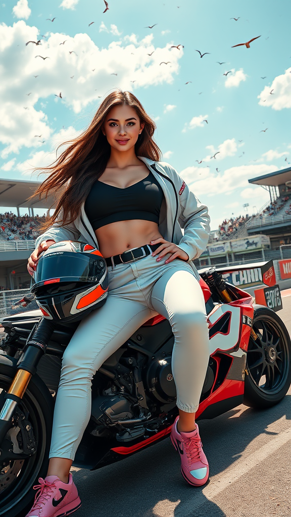 A stunning full body portrait of a captivating woman, an enchanting racecar girl striking a pose on a sleek racecar while holding a motorcycle helmet. Her sun-kissed skin and flowing long hair frame a perfectly symmetrical face, accentuated by a warm smile. Her reflective eyes are highlighted with dark eyebrows and mascara, accented through a blend of makeup. Floating dust particles dance in the air, captured by intricately detailed lighting, including rim and dramatic chiaroscuro effects. She's dressed in a black crop top, with an open white racing jacket hinting at her style, alongside white yoga pants and standout pink sneakers. The race track scene features red racecar with spoilers, bleachers filled with fans, and a backdrop of blue sky dotted with clouds and birds. This masterpiece is crafted in an exquisite professional majestic impressionism oil technique, inspired by influential artists like Waterhouse, John Constable, and contemporary talents like Atey Ghailan and Studio Ghibli. It trends on prestigious art platforms like ArtStation and CGSociety, boasting intricate high detail, a dramatic flair, and a nod to Makoto Shinkai's Kyoto style. The scene comes alive with a pink car and dynamic design elements, encapsulated in a high-quality canvas frame with a touch of cartoonish whimsy.