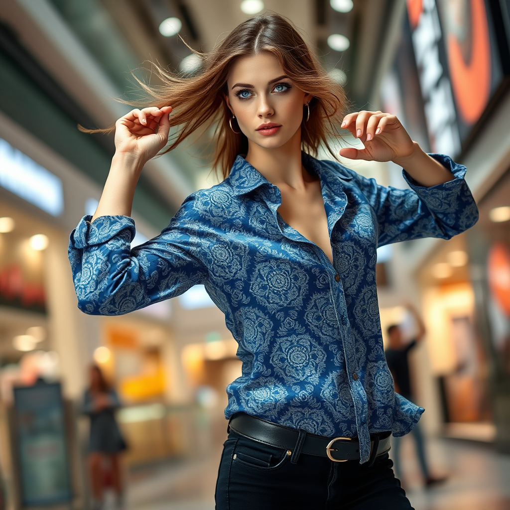 A stunning full body portrait of a graceful model with striking blue eyes, captured mid-dance, wearing an intricate blue batik casual shirt and sleek black jeans. The scene is a high-fashion editorial shot, showcasing remarkable detail and contrast, set against the vibrant backdrop of a bustling indoor mall. Subtle creative touches enhance the essence of movement and style, making this a true masterpiece.