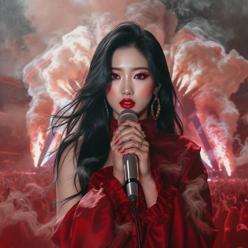 A stunning full-body portrait of a mesmerizing K-pop rockstar woman performing at a massive concert, featuring a captivating Korean visage with expressive eyes and intricate detailing. Her striking black hair flows gracefully, framing a face adorned with blush and lipstick. Her eyes are large, reflective, with detailed pupils and long eyelashes, accentuated by red eyeshadow. Multiple rings embellish her fingers, and her red lips add a touch of glamor. The scene is enveloped in dramatic volumetric fog and smoke, creating a magical atmosphere reminiscent of a professional impressionist oil painting by masters like Waterhouse, John Constable, and modern artists such as Jeremy Mann and Greg Manchess. The setting is both intricate and highly detailed, capturing the essence of an iconic performance and trending on platforms like ArtStation and CGSociety. The composition is a harmonious blend of elegance and drama, with an aspect ratio of 9:16, representing the pinnacle of artistry in the world of digital art.