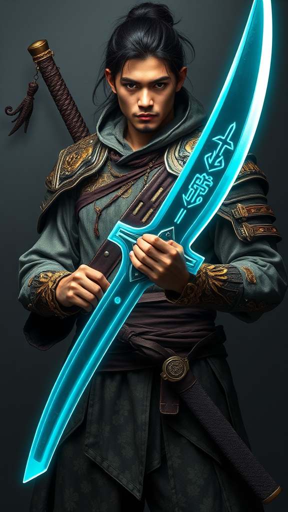 A stunning full body portrait of a strikingly beautiful warrior dressed in intricately detailed casual attire reminiscent of a master swordsman, showcasing a confident stance. He holds a brilliantly glowing bioluminescent curved blade, its luminescence casting a soft glow on his armor. The image is a unique, one-of-a-kind masterpiece with sharp, 8k clarity, capturing the warrior's powerful aura and meticulous craftsmanship in the fabric and weaponry. The composition is perfectly balanced, with every detail meticulously rendered, ensuring a lifelike representation with flawless anatomy and expressive features. The vibrant colors and dynamic pose emphasize his strength and grace, creating an unforgettable visual narrative.