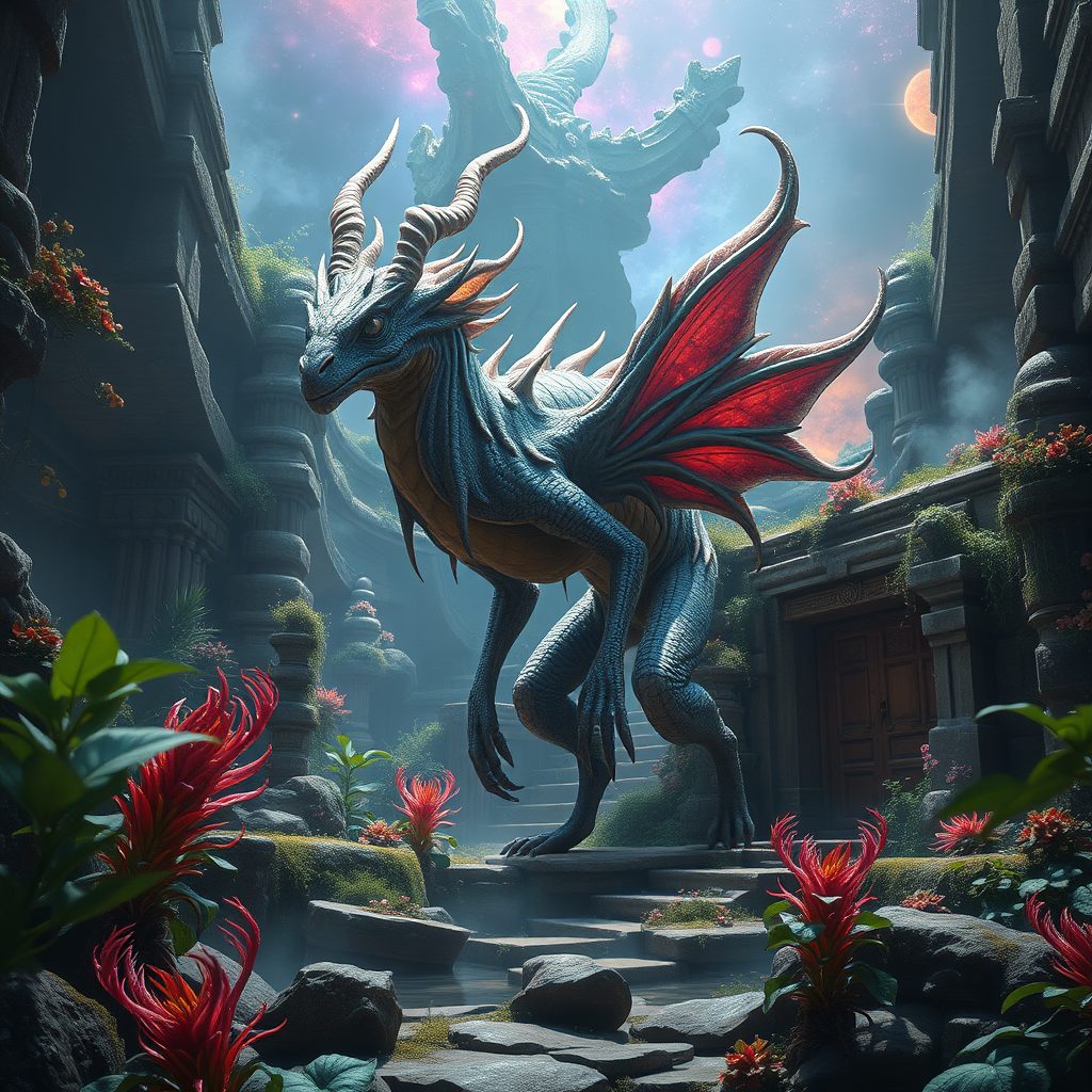 A stunning full body portrait of an enchanting fantasy creature, captured with luminous, professional photography techniques, embodying a true masterpiece of artistry. Designed with the precision of an unreal engine, this very high detailed depiction transports viewers to an extraordinary fantasy planet. Inspired by the works of Jean Ansell, Justin Gerard, and Greg Rutkowski, the scene is alive with dynamic lighting that highlights intricate elements. Nestled within lush plants and vibrant flora and fauna, the creature stands amidst cinematic, ancient ruins, enveloped by colorful nebulas and ethereal mist. The overall scene emanates a sense of wonder and dreamlike beauty, balancing the fantastic with the timeless allure of antique aesthetics.