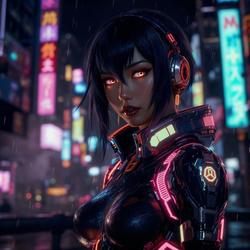 A stunning full-body portrayal of a cyberpunk netrunner girl, drawing influence from Artgerm, WLOP, Ilya Kuvshinov, RHADS, Loish, and Rossdraws. Her face is exquisitely detailed with perfect shading, exuding a sense of intrigue and confidence. The lighting is soft and studio-like, enhancing her photorealistic features in a cinematic manner with HDR and octane render quality. Her sleek, futuristic attire is an intricate blend of neon and metallic textures, highlighted through 4K and 8K resolution. The composition features ethereal edge lighting that accentuates her form, adding depth to her enigmatic persona amidst a vibrant urban landscape.