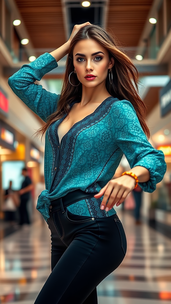 A stunning full-body shot of an elegant model with striking blue eyes, gracefully dancing in a vibrant teal batik casual blouse paired with sleek dark jeans, captured in a fashion-forward editorial style, showcasing intricate details and masterful composition, set against the dynamic backdrop of a bustling indoor shopping mall with high contrast lighting enhancing the visual impact.