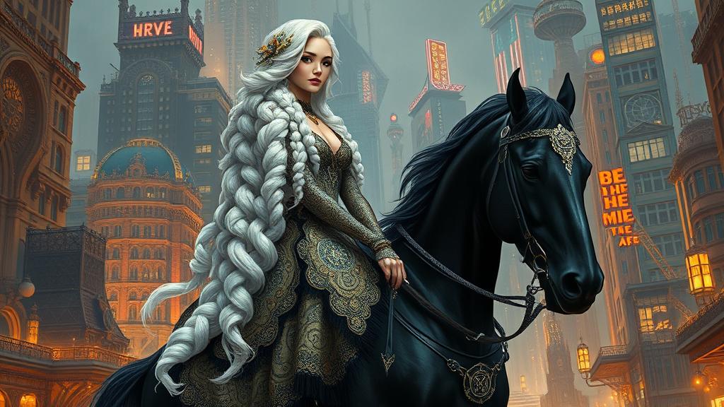 A stunning full-height portrait of a captivating Lady Godiva, her enormous snow-white braid cascading down her back, wearing an exquisitely detailed mini dress that glimmers with intricate patterns, gracefully riding a majestic black stallion through a mesmerizing steampunk cityscape. The scene bursts with intricate details and textures, capturing a harmonious blend of elegance and strength, all in a smooth and sharply focused composition. Concept art inspired by the visionary styles of Ruan Jia, Ilya Kuvshinov, Alphonse Mucha, and Ross Draws, this creative vision transports you to an imaginative world where tradition meets innovation and beauty rides alongside industrial grandeur.