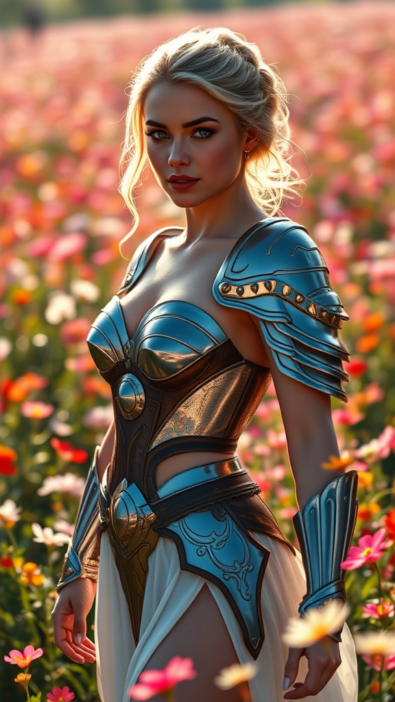 A stunning full-length hyperrealistic portrait of a divine beauty resembling Margot Robbie, standing gracefully in a vibrant flower-filled field. Her exquisite, detailed face exudes elegance, while her full body is adorned with stylish, skimpy armor that highlights her goddess-like presence. Sunlight filters through, creating ethereal god rays adding to the cinematic atmosphere. The artwork boasts intricate and highly detailed character design, concept art, and digital painting, capturing the enchantment and realism of this scene. Despite the hyperrealistic approach, the portrait maintains a sense of polish and sophistication, steering clear of any imperfections or distortions.