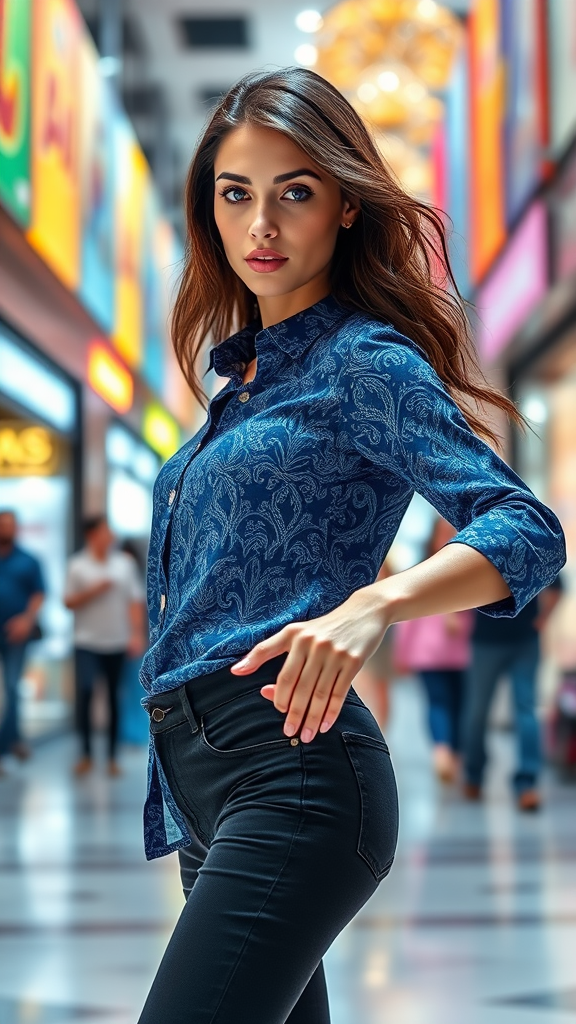 A stunning full-length portrait of an elegant model with striking blue eyes, gracefully dancing in a stylish blue batik casual shirt paired with sleek black jeans. This fashion editorial shot captures her in exquisite detail, showcasing a masterpiece of high contrast against the vibrant backdrop of a bustling shopping mall with colorful displays and ambient lighting.