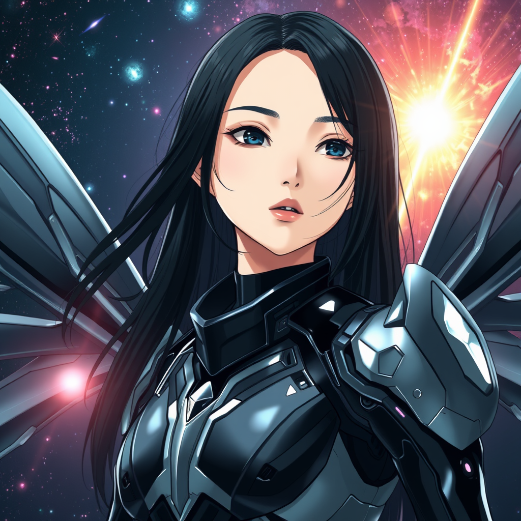 A stunning full portrait close-up of a beautiful girl in a sleek, futuristic exo-suit; her gorgeous, dreamy face framed by long, flowing black hair and a slender figure, gazing thoughtfully into the distance. She is enveloped in a glossy, highly detailed black and silver insectoid Sci-fi mech, with intricate, Sci-fi wings designed in an insectoid style. This artwork channels the aesthetic of Tsutomu Nihei and Akira, set against the vivid backdrop of a bright quasar and the vastness of outer space. The dramatic scenery is highlighted by space starlight, galaxies, and radiant plasma beams. This piece is rendered in 8k ultra-high definition, utilizing volume graphics with anime and manga influences. Hyper-realistic, complex lighting effects add a dynamic quality to this epic piece.