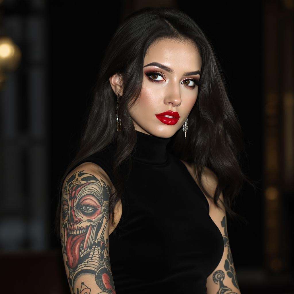 A stunning full sleeve tattoo is showcased on a woman with striking red lips, wearing a form-fitting all-black sleeveless dress. The photograph captures an intricate, highly detailed face in 8k HD quality. Shot with a Canon R5 and a 200mm lens in sharp focus, the image is captured in RAW format. The high contrast, photorealistic image is a professional masterpiece, emphasizing realistic skin textures and lifelike detail. Inspired by ultra-high resolution CGI and rendered with cinematic lighting, this photorealistic digital art is trending on Artstation. The use of a Nikon D850 with Kodak Portra 400 film stock lends rich colors and texture, combined with Unreal Engine’s rendering effects. The result is a hyper-realistic, vividly detailed portrait, perfect for high-definition wallpapers, showcasing dramatic lighting and impeccable detail, free of imperfections.