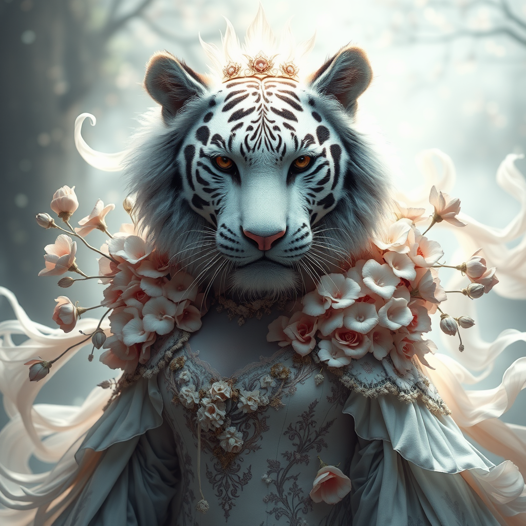 A stunning full view ultrarealistic portrait of an ethereal fantasy hybrid white tigress adorned in an exquisite flowing gown, intricately decorated with flowers, embodying a sense of spirituality. This 4k digital masterpiece takes inspiration from the works of Anna Dittman, Alberto Seveso, Ruan Jia, Rossdraws, Artgerm, Greg Rutkowski, Alphonse Mucha, Loish, and WLOP. It features a blend of fantasy and hyper-detailed realism, with soft, enchanting lighting. The scene is an ode to fantasycore, capturing the mystical allure of its subject and is beautifully showcased on Artstation.