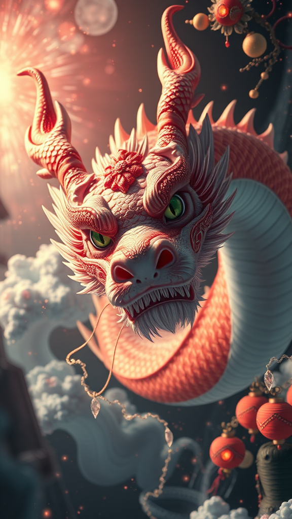 A stunning fusion of Kyoto Animation-style anime and traditional Chinese art, depicting a majestic dragon soaring through a modern cyberpunk fantasy world. The scene is illuminated by cinematic lighting and ethereal glows, showcasing intricate and exceedingly detailed designs. Every element is richly colored and hypermaximalist, capturing the essence of a masterpiece. The vantage point offers an aerial view in HDR and UHD quality, reminiscent of Unreal Engine visuals. The dragon, with its plump and smooth features, gazes directly at the viewer against a dark fantasy backdrop adorned with glittering jewelry. The focus is on fair skin and a beautiful face, emphasizing high quality and richness in detail. The scene is rendered in 8k, with an emphasis on lighting and shadow play, and showcases intricate decorations and detailed lines, creating a gorgeous, glamorous atmosphere.